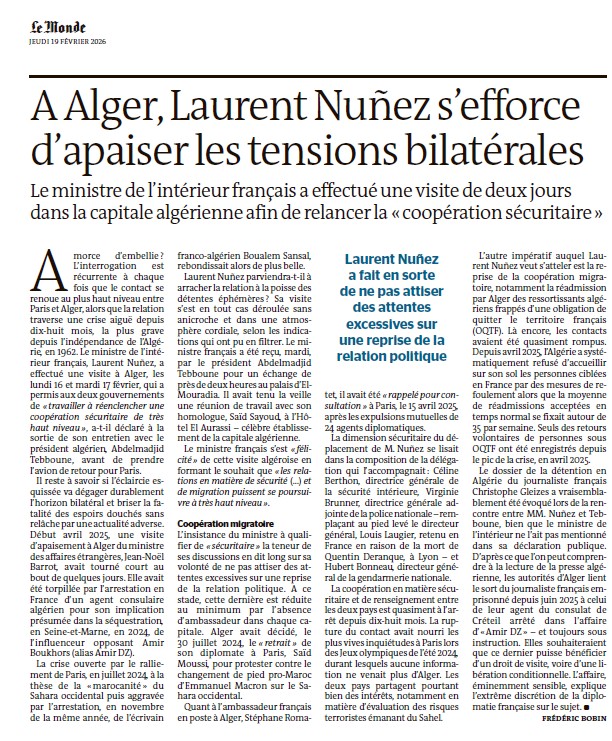 Le cœur des discussions a porté sur la délicate question migratoire, avec la volonté de relancer la délivrance des laissez-passer consulaires nécessaires à l’exécution des mesures d’éloignement, un processus quasiment paralysé depuis le soutien français au plan d'autonomie marocain pour le Sahara occidental. Au-delà des chiffres, la lutte contre les réseaux de narcotrafic en Méditerranée et la surveillance de la zone sahélienne ont occupé une place centrale dans les échanges, soulignant une interdépendance sécuritaire que les brouilles diplomatiques ne peuvent totalement occulter. Enfin, la situation du journaliste Christophe Gleizes a plané sur ce déplacement, sa détention restant un point de friction majeur que la France espère résoudre par cette diplomatie des petits pas. En évitant les sujets mémoriels les plus inflammables, Laurent Nuñez a ainsi jeté les bases d'un redémarrage qui, s'il reste fragile, permet de sortir de l'impasse par une gestion technique et discrète des intérêts communs.